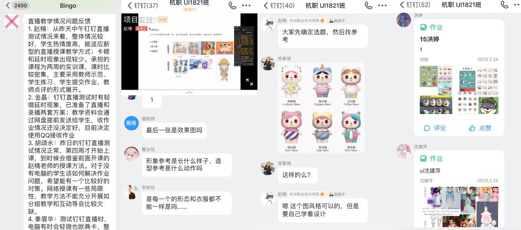 为了避过网络“早高峰”,老师们都早早的进入了直播课堂。数字媒体艺术设计专业的赵楠老师7:17分发起上课点名签到,8:15分正式上课。赵老师从课程导入开始,按照明确教学目标、发布任务、学生实操与作业提交、教师反馈和讲评的教学设计有条不紊开展课堂教学。在教师讲授、学生实操和组织讨论等教学活动中,赵老师根据学生的留言或提交的作业进行针对性讲评,学生也可以请求连麦回答提问或动手操作演示,师生之间一直保持着良性互动。整个上午的教学有序的进行,赵老师连事先录制的备用视频都没有用上。