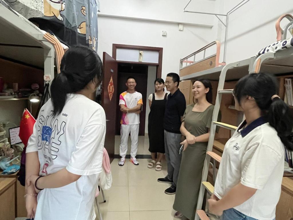 走访过程中,学院领导与同学们进行亲切互动交流,关心询问专业学习、暑期生活、兴趣爱好等情况鼓励同学们珍惜美好的青春时光,扎实学好专业本领自觉遵守规章制度以健康的体魄、饱满的精神投入新学期的学习生活并嘱咐亚运群演、志愿者同学增强使命感和责任感,高质量完成任务,同时做好学习安排,有疑惑的地方及时向老师请教。同学们为老师们送上节日祝福,纷纷表示将以积极昂扬的状态投入到新学期的学习和生活中,全面提升自我,争做新时代好青年。