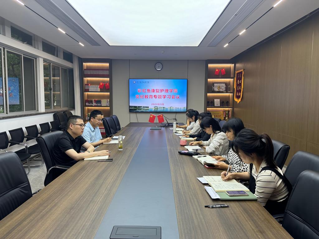 5月29日下午,彩虹鱼康复护理学院理论学习中心组在3209会议室召开党纪学习教育专题学习会。会议由直属党支部副书记杨旭辉主持,副院长郭君平,学院中层教师、支部委员参加会议。
