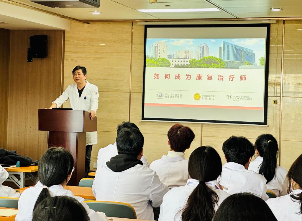 李扬政主任从宏观上分析了浙江省各类型康复机构的现状和3年发展趋势,讲解了康复治疗师的执业条件和执业范围,叙述了浙江省康复治疗从业人员学历概况和大专康复生的就业现状,列举了中专康复出身经过自身努力而成为博士的成功例子,提醒学生要有紧迫感、要重视自我提升。最后表达了欢迎我校康复治疗专业学生到浙江大学医学院附属邵逸夫医院康复科见习、实习。随后,李建华主任引导学生参观了浙江省邵逸夫医院康复科,介绍了浙江省邵逸夫医院康复科内的各亚专科部门,并给学生讲解了各部门的主要接诊对象和工作内容。