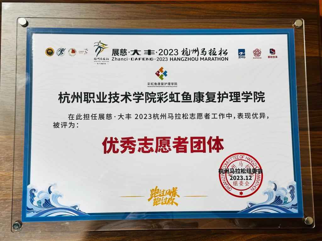 近日,彩虹鱼康复护理学院收到了来自杭州马拉松组委会送来的2023杭州马拉松“优秀志愿者团体”的荣誉牌匾,杭马组委会对彩虹鱼康复护理学院青年志愿者的辛勤付出、优异表现表示肯定。