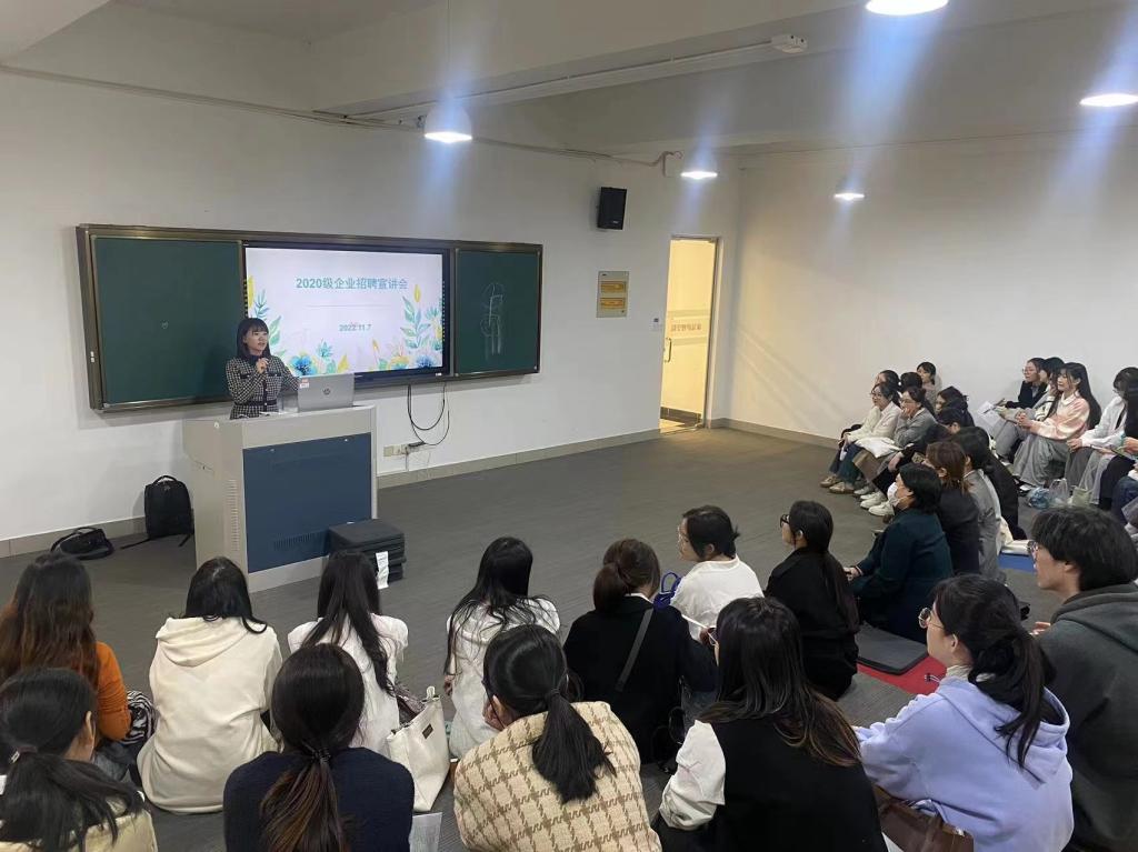为拓宽就业渠道,给康复护理专业应届毕业生提供更多优质的就业机会,实现毕业生高质量就业,11月7日下午,彩虹鱼康复护理学院在3号楼阶梯教室举行企业招聘宣讲会。宣讲会上重点邀请了杭州彩虹鱼康复护理有限公司、浙江骨伤医院、杭州贝康健康科技集团有限公司、宁波奥克斯医疗集团、果陀母婴服务有限公司等5家企业。彩虹鱼康复护理学院直属党支部书记、副院长韩丹、康复护理专业2023届毕业生、班主任及全全体实习指导教师参加了宣讲会。会议由康复护理专业负责人魏国芳主持。