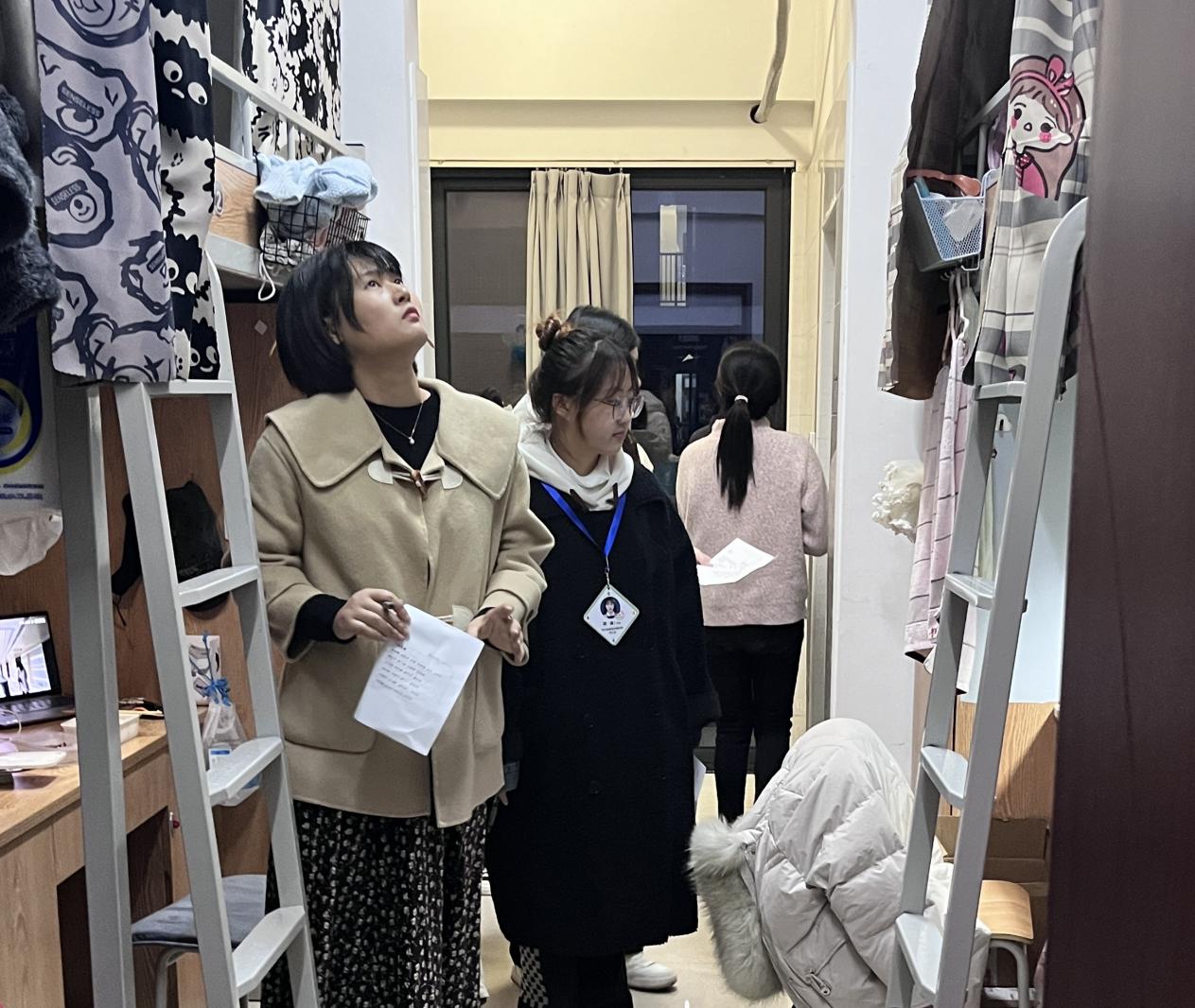 12月9日,由学院学工办主任王正、辅导员郭常娟和7名学生干部代表组成的文明寝室检查评选工作组,前往学生公寓进行走访,开展了“文明寝室”检查评选活动。结合前期申报材料,工作组从思想认识、遵守纪律、学习氛围、活动参与、内务整理、宿舍文化等多个方面进行考评,对于发现的安全隐患及时提出,同学当场整改。经过评选,锦晖苑B2-5057、B2-5063、含晖苑4号楼118共3个寝室脱颖而出,由分院推荐参加校级文明寝室评选。锦晖苑B2-5056、B2-5073、B2-5077共3个寝室被评选为分院文明寝室。