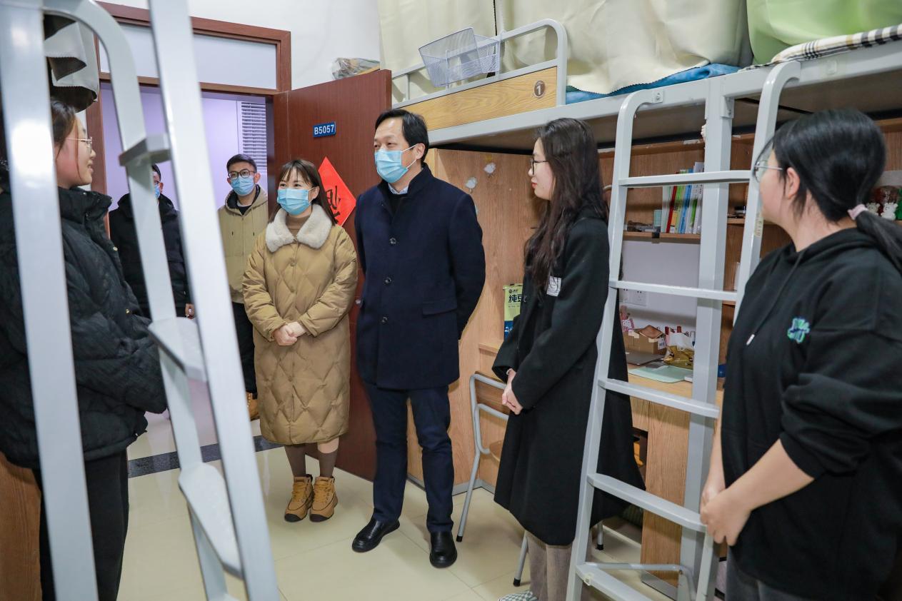 “家乡是哪里的?线上上课还适应吗?学校生活适应吗?”金波书记一走进学生宿舍,就亲切地向同学们询问了学习进展、生活情况、期末备考的复习安排等问题,仔细倾听了学生诉求,了解学生心理状况,勉励同学们根据教学进度,完成网上学习,嘱咐大家要加强个人防护、错峰返乡。在走访过程中,金书记还关注到学生寝室楼层较高,搬运行李不便等问题,强调要第一时间回应学生诉求,不断优化管理服务,学校也将为返乡学生提供免费爱心送站服务,为广大学生营造安全、舒适、便利的校园环境。