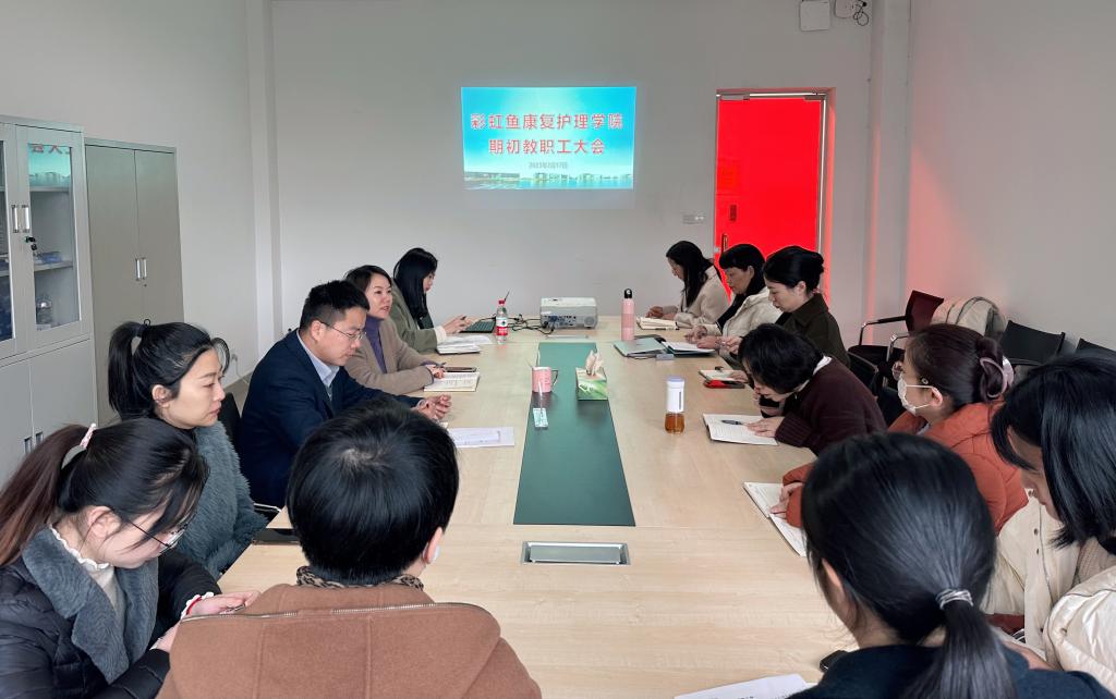 2月17日上午,彩虹鱼康复护理学院在3202会议室召开新学期教职工大会,学院全体教职工参加。会议由韩丹主持。