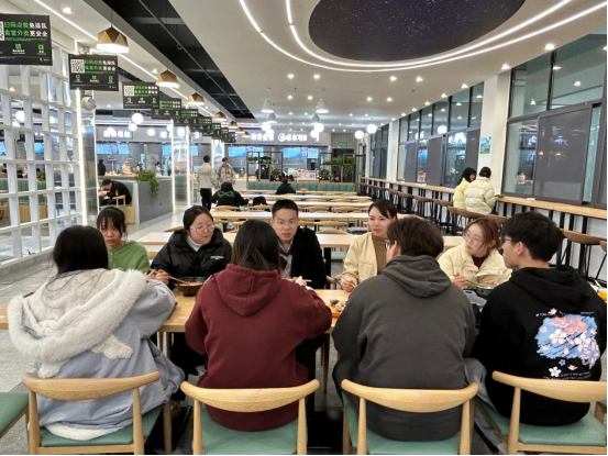 在含晖苑学生食堂,学院领导与学生一起排队打饭,围桌而坐,边吃边聊,面对面亲切交流,气氛温暖融洽。韩丹关切地询问了学生们的学习生活情况,详细了解了学生对专业学习、后勤服务、学院发展等方面的意见建议,解答了同学们的疑惑。郭君平结合临床和教学工作经验,勉励大家树立远大理想,提升专业技能,做好学业规划,努力成为社会有用之材。