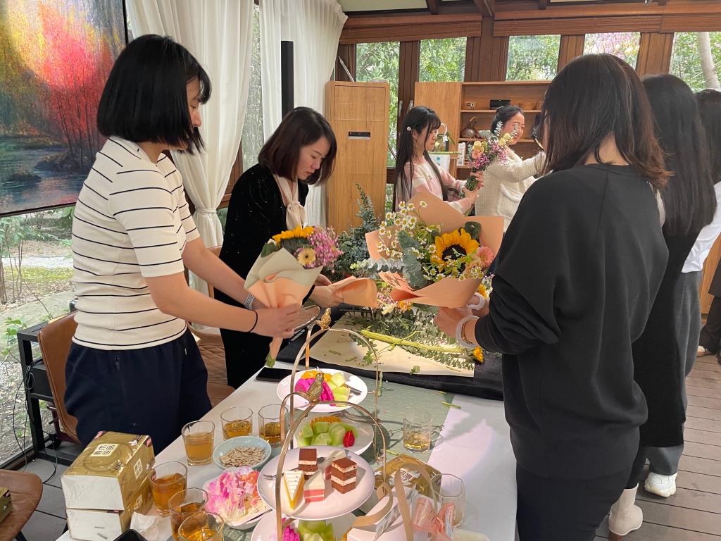 讲座结束后,开展“不忘初心 美丽鲜花献给党”的活动,在场的各位党员结合着自己对党的祝福与向往纷纷动手制作着美丽的花束。温馨浪漫的满天星、芳香流溢的白桔梗、玲珑可爱的小雏菊、色彩斑斓的康乃馨,在党员们一双双巧手打扮下被赋予新的生命与祝福,将代表朝气蓬勃的鲜花献给党,让革命先烈的精神永传承。插花活动在欢声笑语和花的海洋中落下帷幕,大家既体验了插花艺术的优雅,又享受着亲自创作的乐趣,更重要的是寄语对党的热爱与祝福,对幸福生活的热爱。党员们在这次活动中陶冶了高雅情趣,品味了美好生活。
