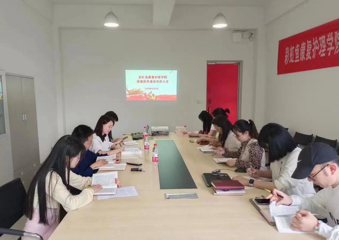 为全面贯彻党的二十大精神,进一步推动我院教师师德师风建设,提高教师队伍整体素质,规范教师职业行为,4月24日下午,彩虹鱼康复护理学院在3202会议室召开师德师风问题整治工作动员部署会。全体党员教师参加了会议,会议由学院直属党支部书记韩丹主持。