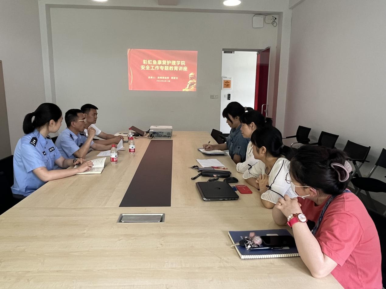 为进一步加强学院安全教育工作,筑牢安全底线,6月16日中午,彩虹鱼康复护理学院在3202会议室开展安全工作专题教育讲座。本次讲座邀请钱塘区公安分局白杨派出所黎舒卫警官主讲,保卫处治安科科长黄伟斌、学院学工办主任王正、全体辅导员和班主任参加。