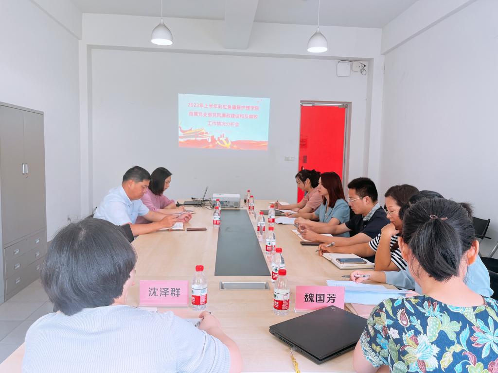 6月21日上午,彩虹鱼康复护理学院直属党支部在3号楼202会议室召开2023年上半年党风廉政建设和反腐败工作情况分析会。校党委委员、学校副校长程利群、学校纪委副书记、主任韩亮、彩虹鱼康复护理学院直属党支部书记、副院长韩丹、副院长郭君平及全体中层干部参加会议,韩丹主持会议。