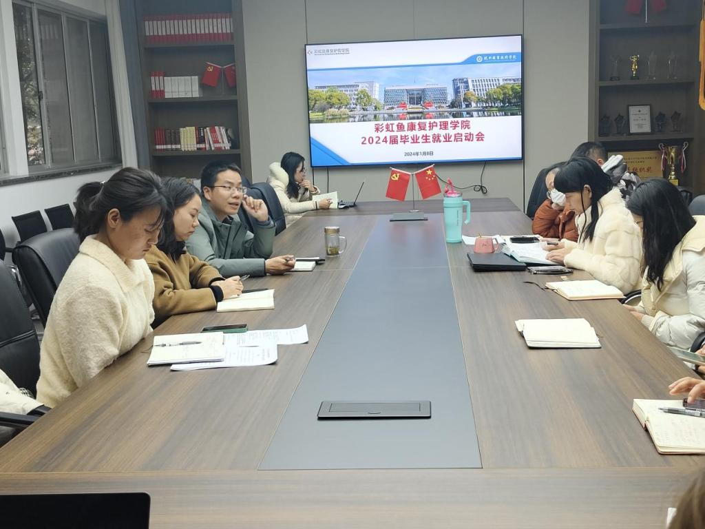 1月8日下午,彩虹鱼康复护理学院在3209会议室召开2024届毕业生就业启动会,直属党支部书记、副院长韩丹,副院长郭君平、各专业负责人、学工办、教科办、综合办、毕业班班主任和实习指导老师参会。会议由学工办主任王正主持。