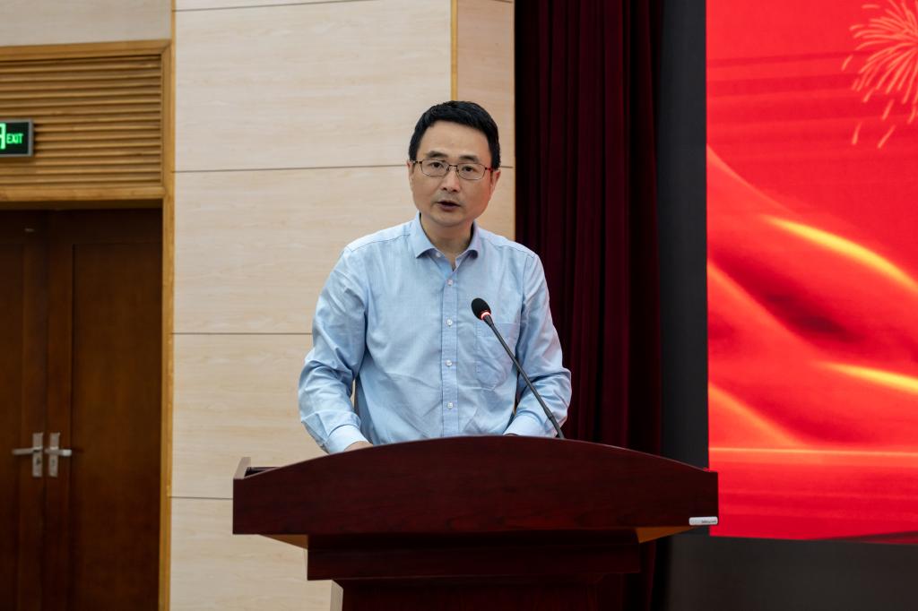 副校长楼晓春讲话,他代表学校对护理专业同学们致以节日的祝贺,对工作在护理一线的护理工作者表示敬意和慰问,对支持学院发展的领导、专家和老师表示感谢。楼晓春充分肯定了彩虹鱼康复护理学院近年来在社会服务、深化合作等方面取得的成绩,同时对老师和同学们提出殷切期望。他希望,老师们要继续弘扬南丁格尔精神,提升教学水平,为助推学校和护理事业高质量发展作出新的贡献;希望同学们要在未来的护理工作岗位上,恪守医德医风医道,在技术上精益求精、在服务上主动关心,走好成长成才之路,成为行业能手,服务“健康中国”。