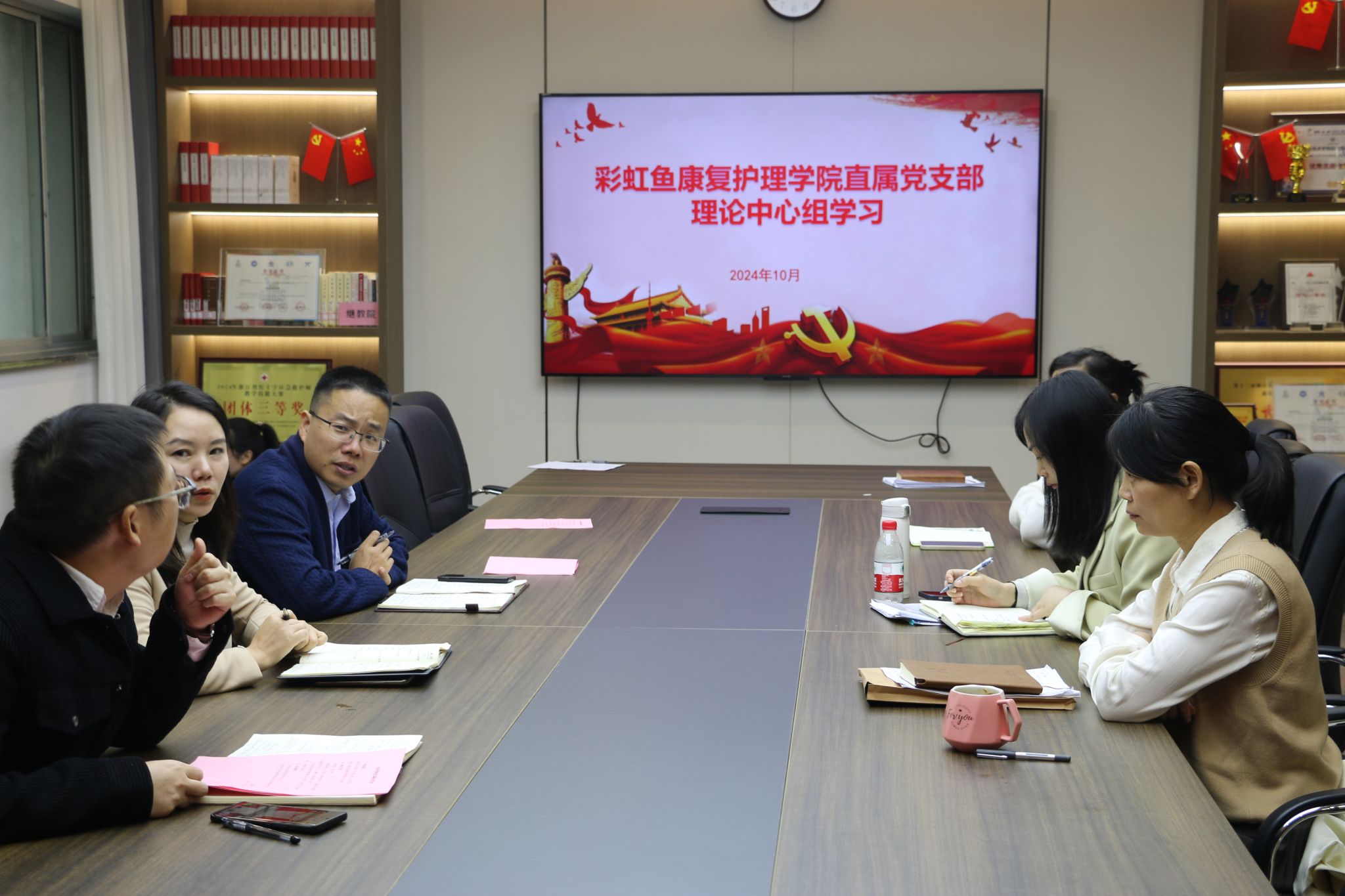 10月23日下午,彩虹鱼康复护理学院在3211会议室召开10月理论学习中心组学习会,专题学习习近平总书记在《求是》杂志发表的关于弘扬爱国主义精神的重要文章。学院领导班子、学院中层干部、支部委员参加学习。会议由直属党支部书记、副院长韩丹主持。