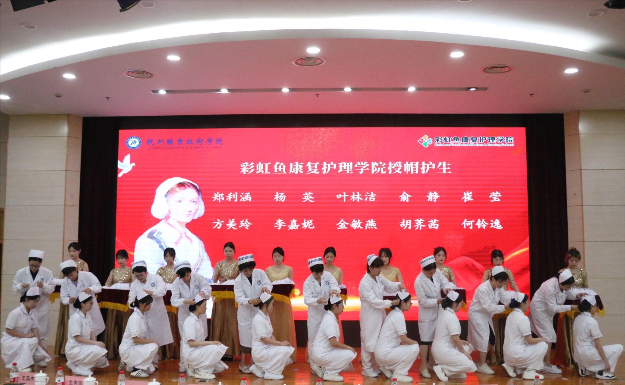 近日,彩虹鱼康复护理学院于行政楼报告厅隆重举办“第114个5·12国际护士节授帽仪式”。学校党委委员、副校长楼晓春,浙江省多位临床护理专家,学院党政班子成员、全体教职工及200余名护理专业学生齐聚一堂,共同庆祝这一美好的节日。仪式由学院直属党支部副书记王英杰主持。