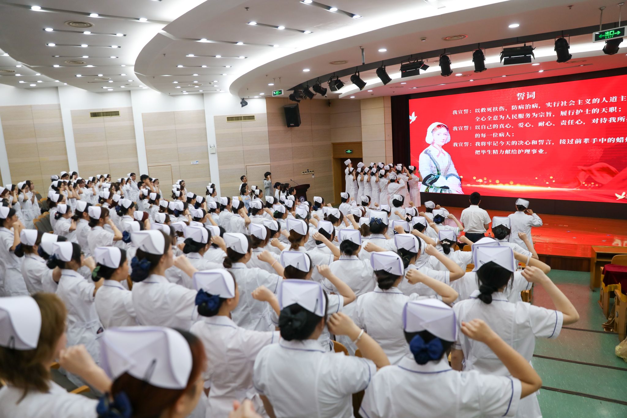 随后,学院领导班子成员、护理专家代表及学生代表依次致辞发言。在肃穆的乐曲声中,授帽仪式正式开始。来自浙江大学医学院附属第二医院护理部副主任赵华等10位资深护理专家,为138名护生逐一佩戴象征护理职业使命的燕尾帽。授帽过程中,护生们单膝跪地、双手托举护士帽,护理前辈躬身授帽,这一仪式不仅是职业身份的授予,更是护理精神的代际传承。授帽完成后,护生们手持烛灯整齐列队,在护理前辈金惠露的带领下,面向南丁格尔画像庄严宣誓。誓言铿锵有力,烛光跃动生辉,充分展现出学子们对护理事业的敬畏之心与无限热忱。同时,学院向全体护生送上寄语:“性命所系,健康所托,清廉行医,两袖清风”,进一步强调护理职业的责任与操守。