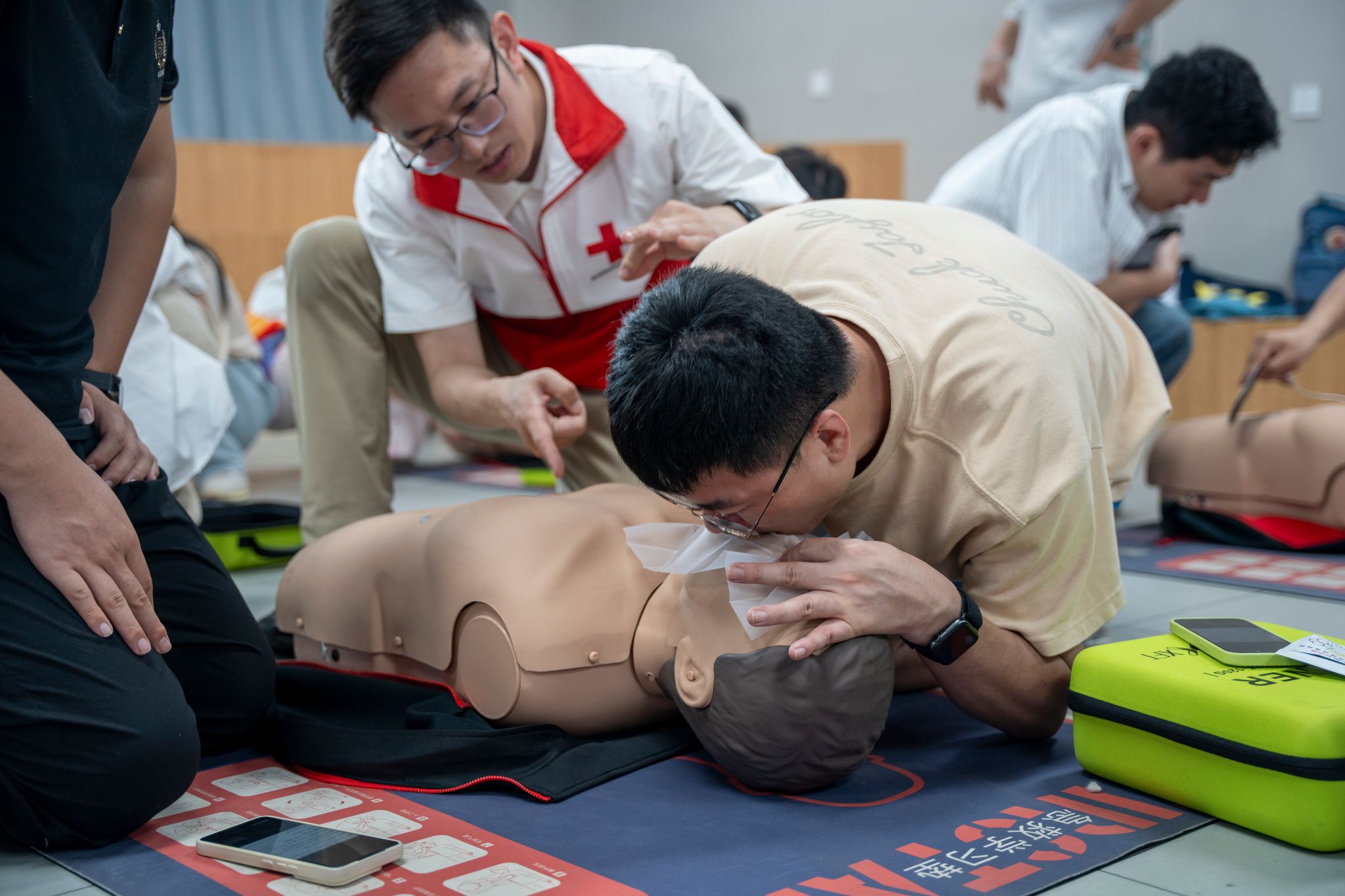 理论学习为学员们筑牢了基础,而实践操作环节则真正锤炼了大家的应急能力。在这一环节中,参训学员们分组进行认真地模拟练习。借助人体模型、绷带、AED训练机等专业工具,汤永珩、乐益娜等老师带领学生志愿者团队,耐心细致地指导学员们胸外按压的力度、人工呼吸的技巧以及止血包扎的要领,并及时提醒并纠正学员们操作中的不规范细节。信息工程学院的李老师在实操后表示:“通过反复练习,我真正掌握了这些操作细节,面对紧急情况时更有底气了,也更有信心去应对可能发生的意外。”