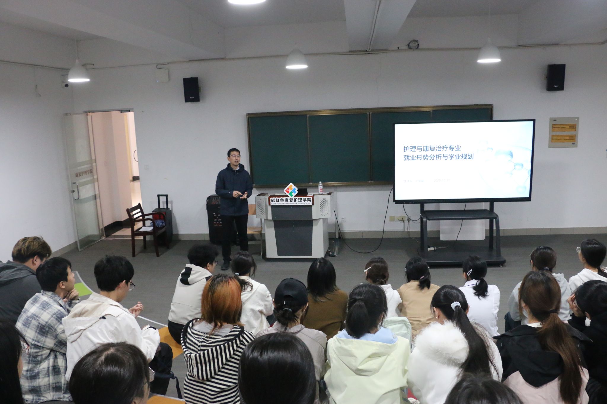 为帮助2025级新生科学规划学业发展、明确专升本路径,10月31日上午,彩虹鱼康复护理学院特邀资深职业规划师、高校创新创业导师刘发骏,开展“护理与康复治疗专业就业形势分析与学业规划”专题讲座。50余名新生积极参与,现场气氛热烈。