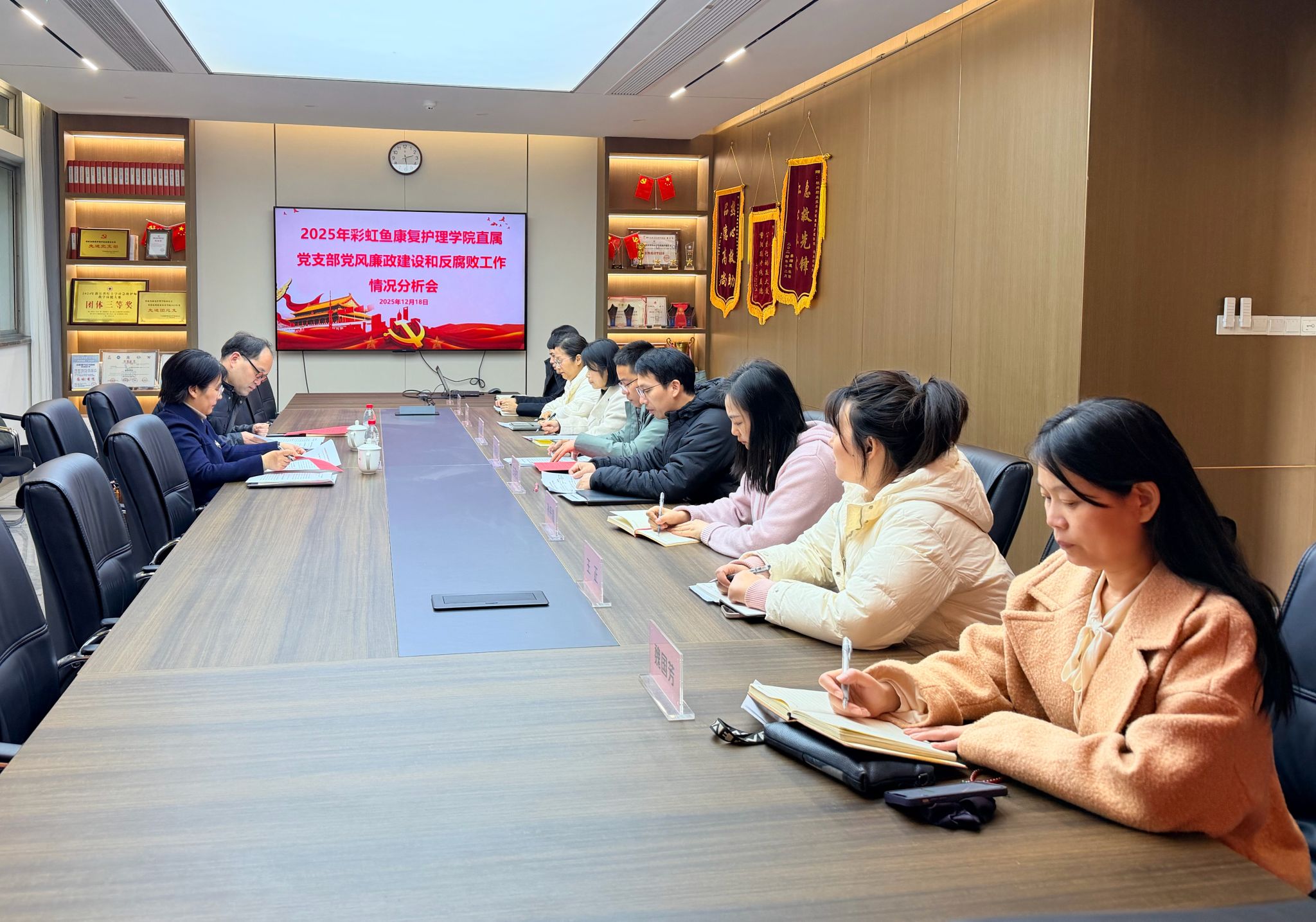会上,王英杰代表班子系统汇报了2025年履行全面从严治党主体责任情况、落实“第一责任人”职责情况,并对上半年党风廉政问题整改情况进行了“回头看”。郭君平汇报了“一岗双责”履职情况。纪检委员汇报了履行全面从严治党监督责任情况。与会中层干部结合康复护理专业教学、科研、管理实际,聚焦理论成果实践转化、教学耗材采购、实习基地管理等重点领域,深入剖析了潜在廉政风险点,并提出了具体防控与整改思路。